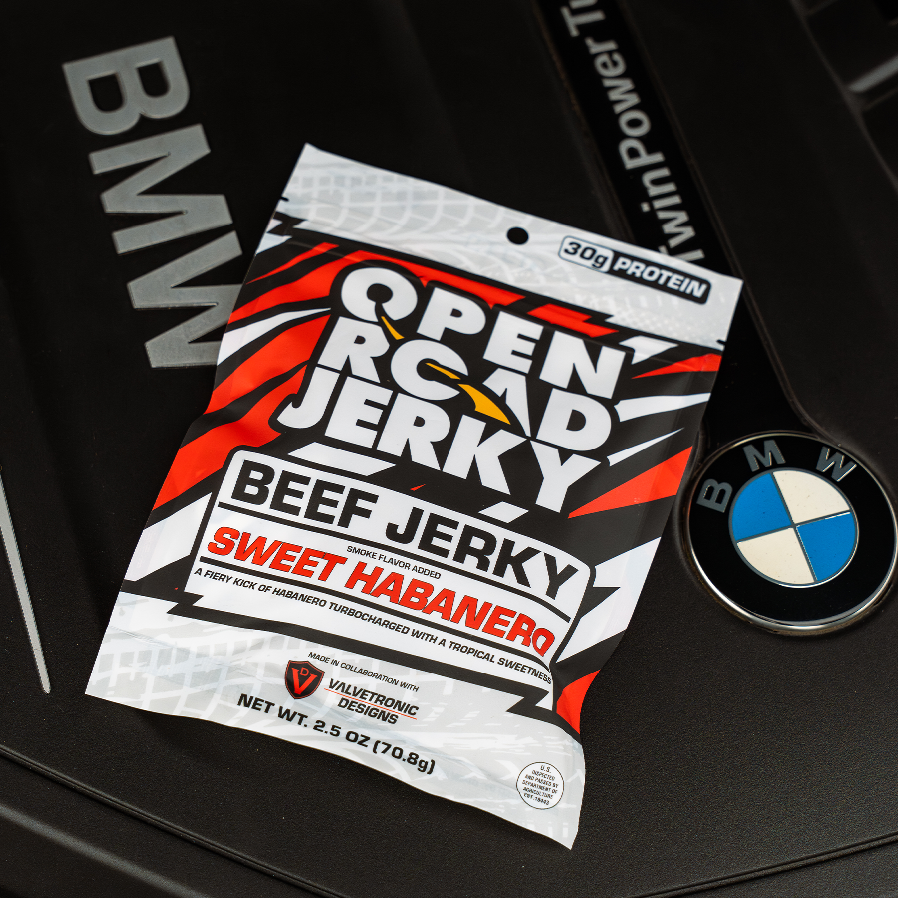 At Open Road Jerky, we don’t settle for anything less than perfection. When we set out to elevate traditional habanero jerky, we asked ourselves, 'How can we make this even better?' and came up with an irresistible recipe. With the addition of fruit juice and REAL Mango Puree, this jerky has a fiery, habanero kick followed up with a subtle, fruity taste. And to top it off, we’ve partnered with the legendary Valvetronic Designs to bring you the ULTIMATE snacking experience.